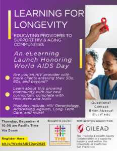 On December 4th, we held a launch event titled “Learning for Longevity: Educating Providers to Support HIV & Aging Communities.” During the event, we provided a detailed introduction to the course and its modules, along with instructions on how to access the course materials. Everything you need to know to access the course is found on this page, but if you’d like to watch the recording, you can click on the link below.